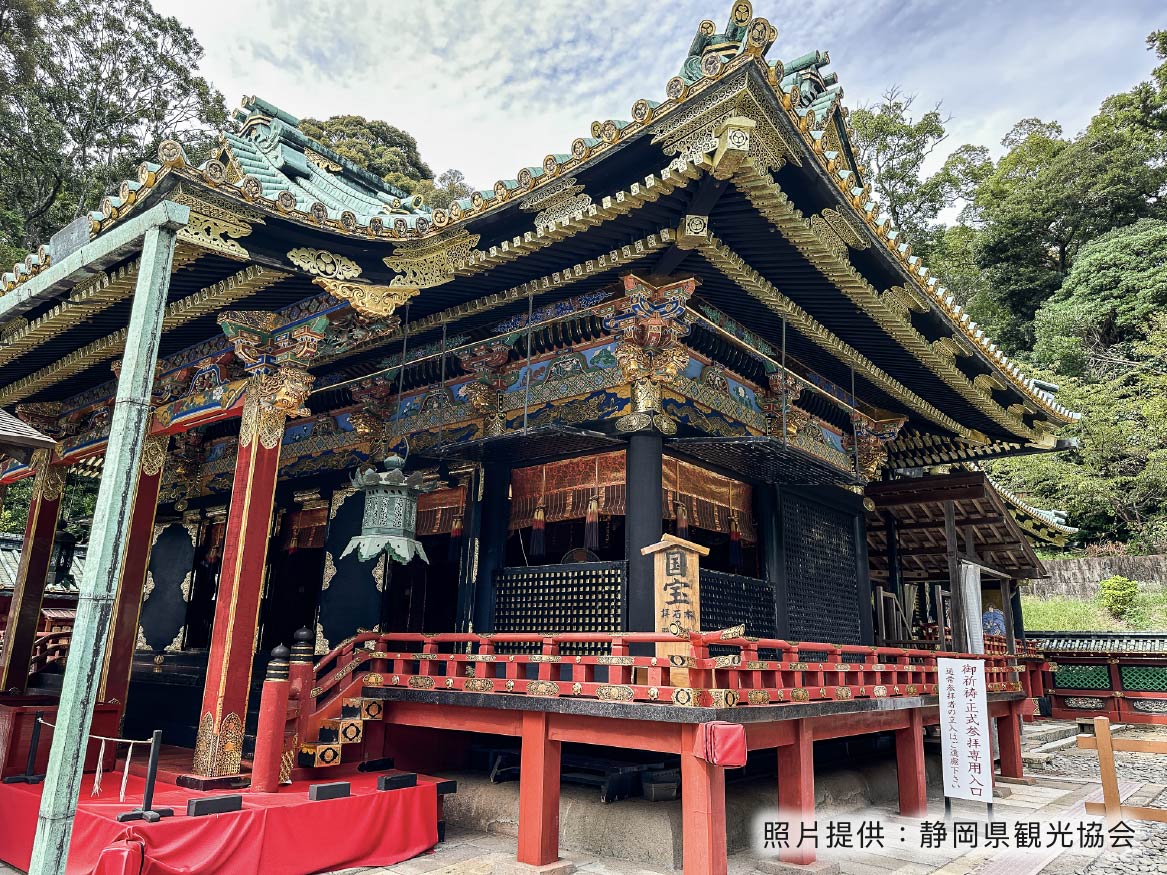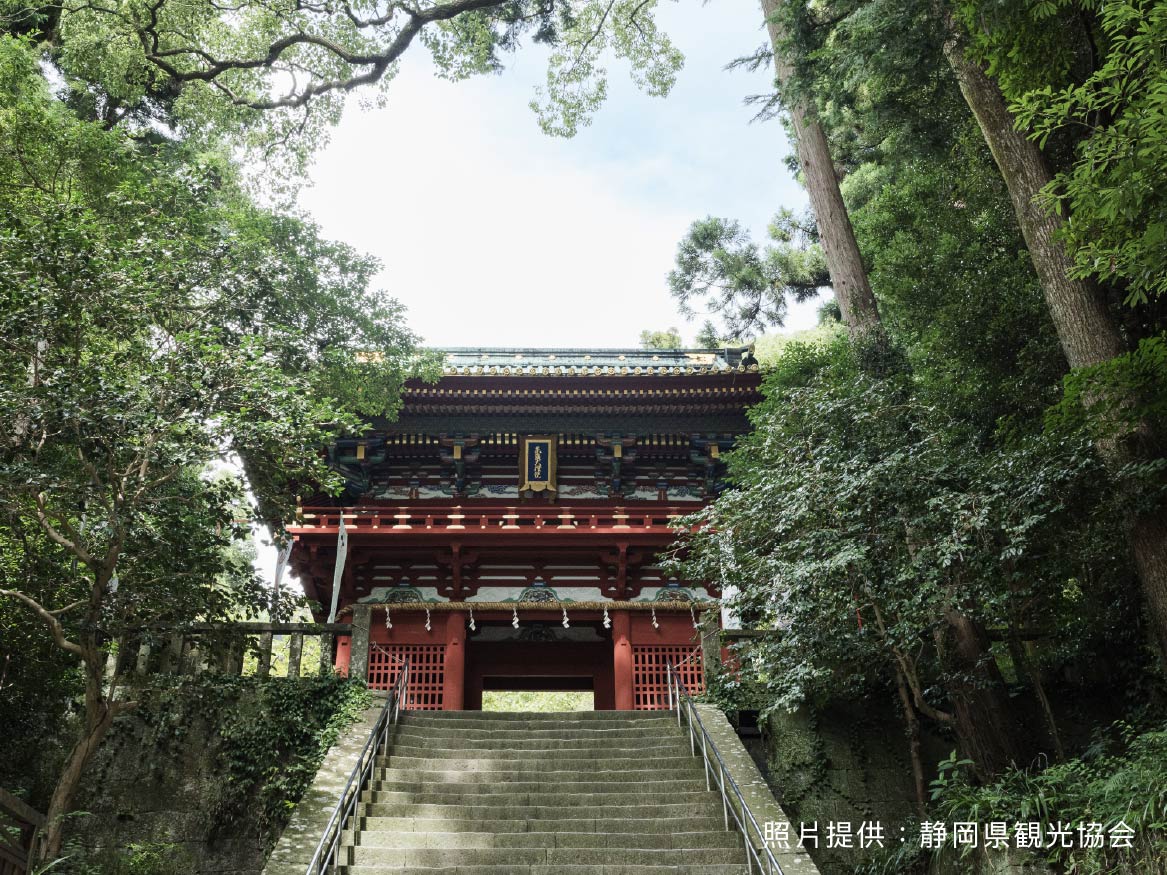 久能山東照宮:日本靜岡市駿河區的久能山山頂,是為了祭祀江戶幕府初代將軍德川家康而建造的神社。根據史料,德川家康的遺體於1616年依其遺願安葬於此,並由其子二代將軍德川秀忠於1617年建立了這座神社。社殿建築風格被稱為「權現造」,具有華麗的漆面和色彩裝飾,是江戶時代初期建築的代表之一,於2010年被指定為國寶。