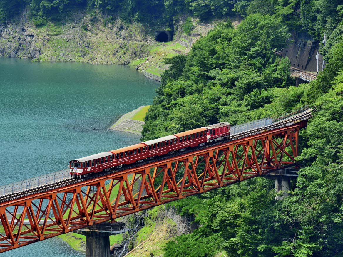 大井川鐵道井川線-「405號列車」:主要行駛於千頭站至井川站之間,全長約39.5公里。此路線以獨特的ABT齒軌系統聞名,是日本唯一的ABT式齒軌鐵道。列車沿途穿越山區、溪谷,經過多個隧道與橋樑,提供壯麗的自然景觀。其中,奧大井湖上站更是日本唯一的水上浮島車站,吸引眾多攝影愛好者前來拍攝。