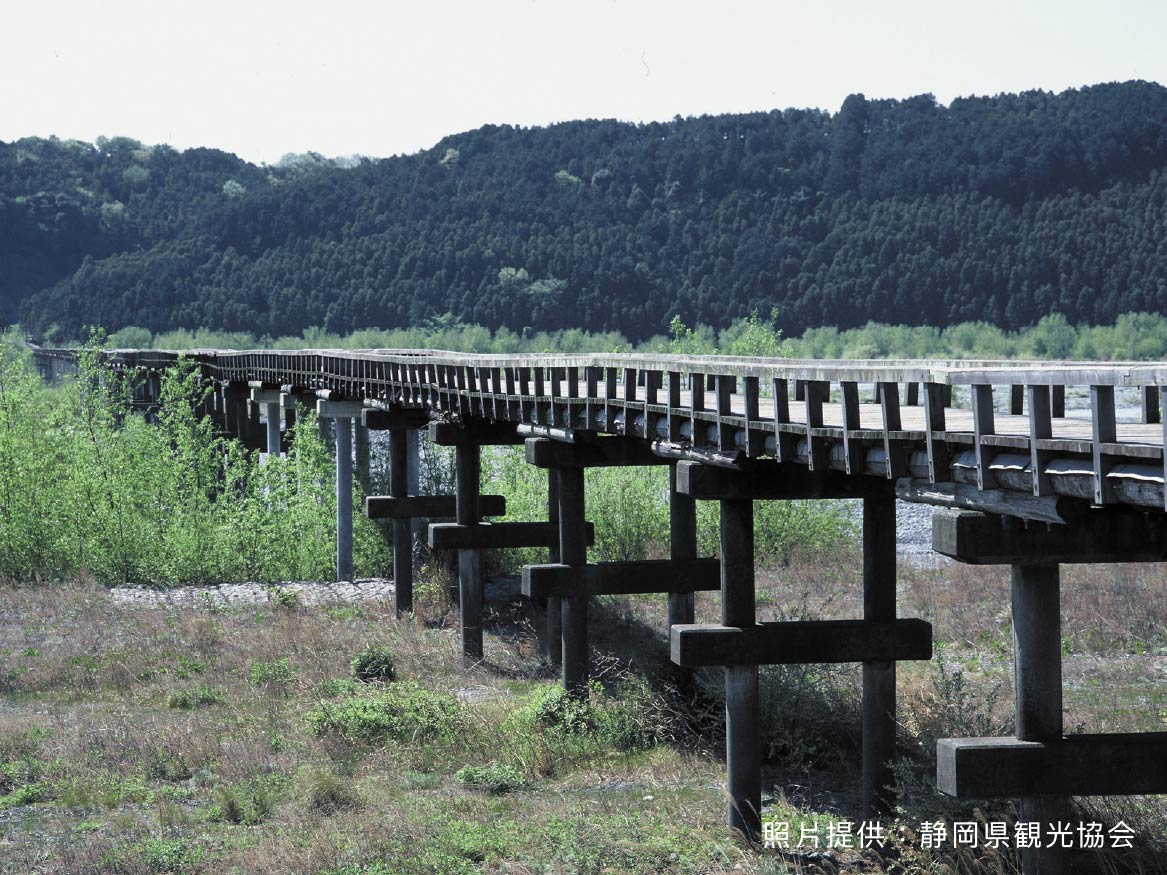島田蓬萊橋:位於日本靜岡縣島田市,橫跨大井川,全長897.4公尺,是日本最長的木造人行橋之一。建於明治時代,以傳統木造結構融合精湛工藝而聞名,呈現濃厚的日本傳統建築風格。由於其獨特建築與歷史價值,蓬萊橋於1997年被列為國家有形文化財產。