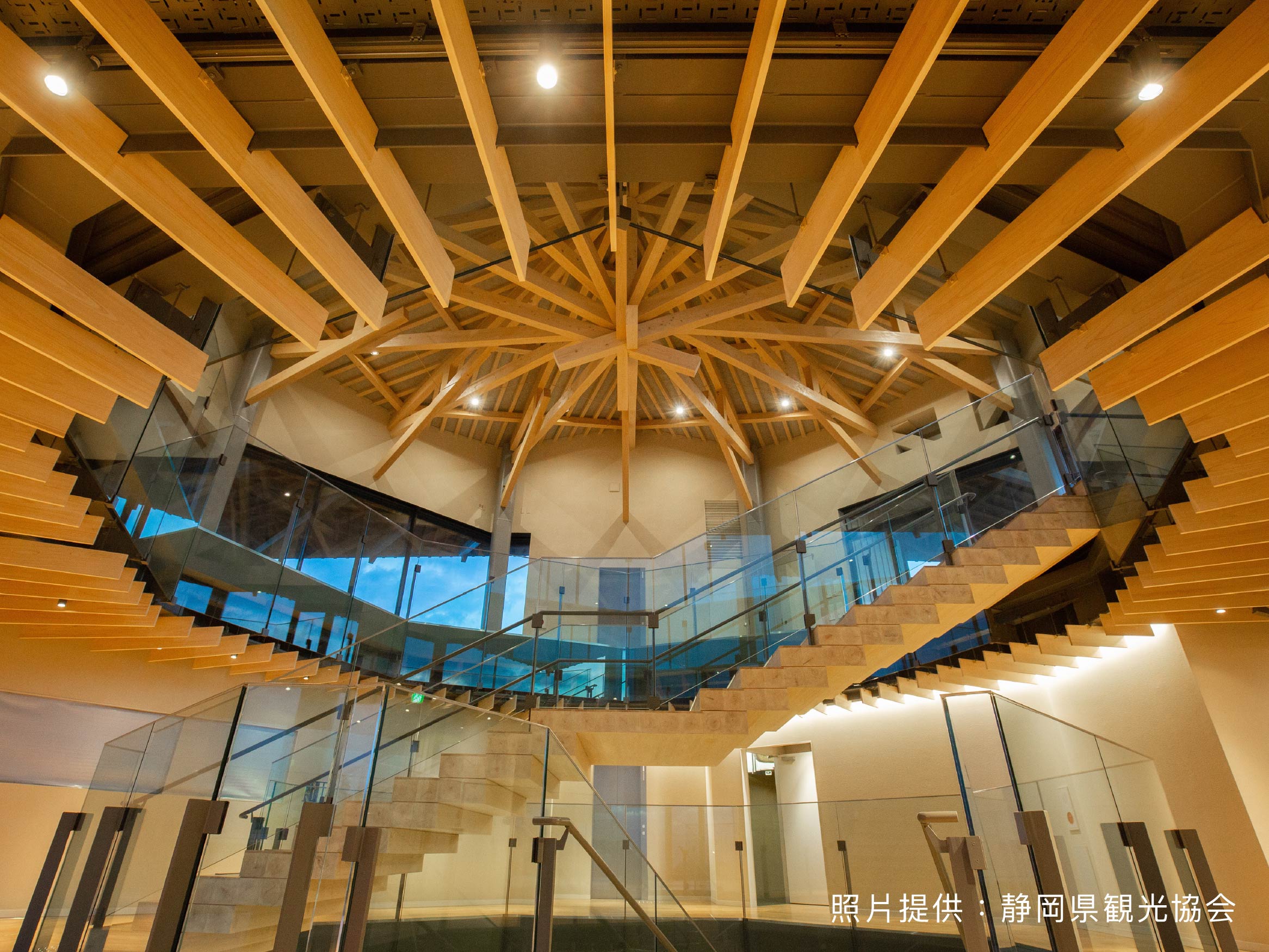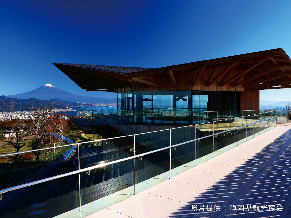 茶坊夢露台(茶房 夢テラス):由日本著名建築師隈研吾設計,是一座現代木造建築,位於靜岡縣靜岡市日本平山頂,毗鄰日本平索道站,為遊客提供絕佳的富士山與駿河灣全景。建築大量採用靜岡縣產木材,外觀以層層疊起的木板呈現優雅曲線,與周圍森林自然融合,展現隈研吾「建築讓步」的設計理念。